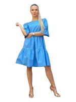 vestito in cotone con balze, azzurro, con manica a tre quarti
