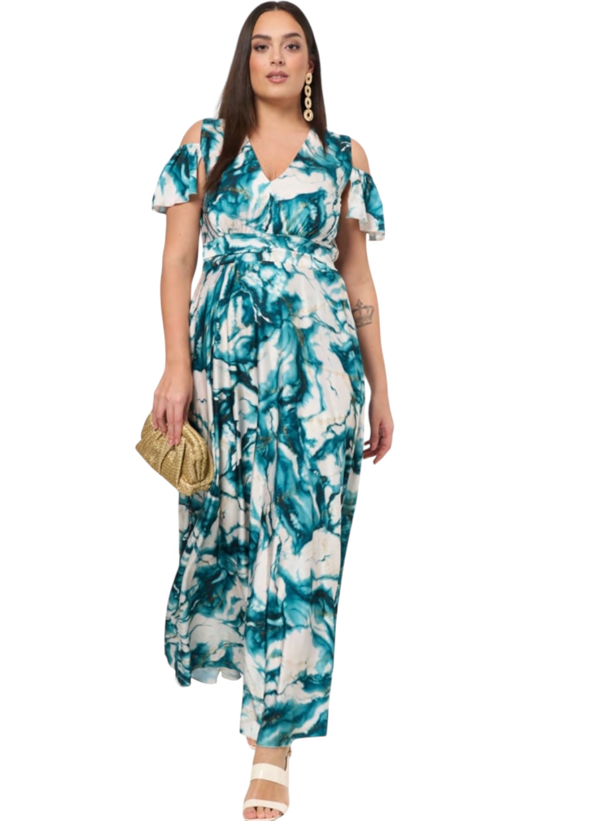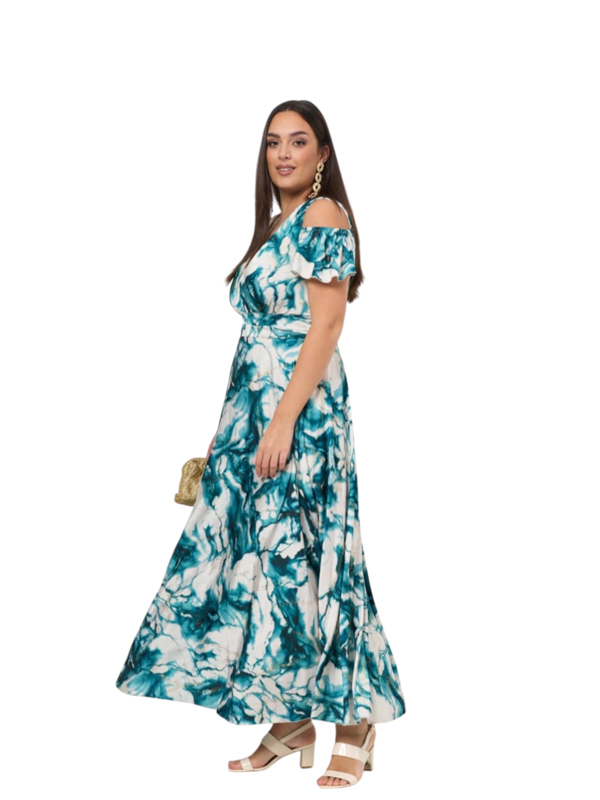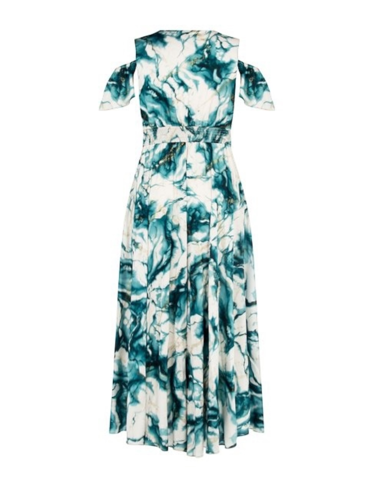 verde reale e panna con dettagli oro laminati, con elastico in vita, scollo a v e manica corta con omero scoperto