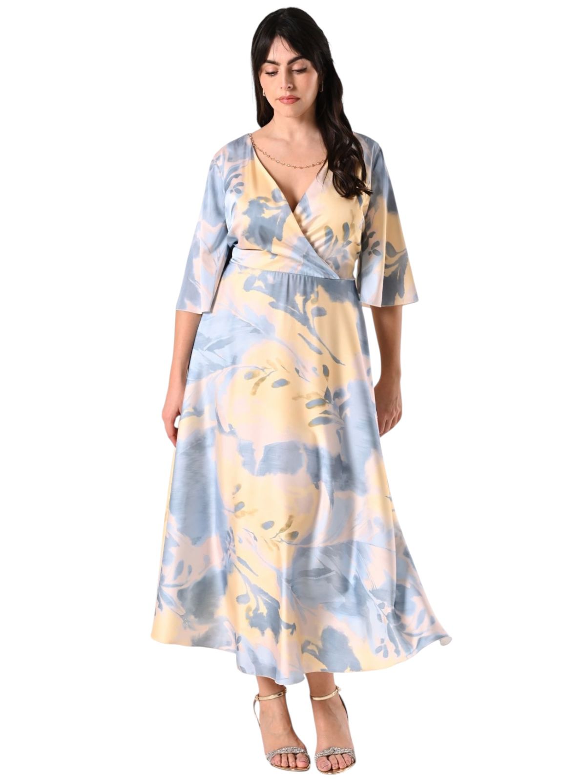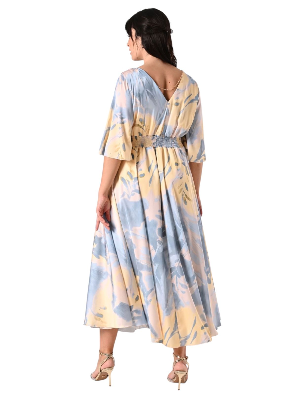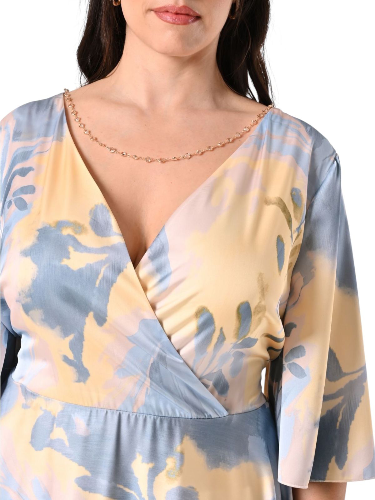 raso stampato, toni del giallo e azzurro, con elastico in vita nel retro, scollo a v e dettaglio collanina gioiello, maniche ad aletta