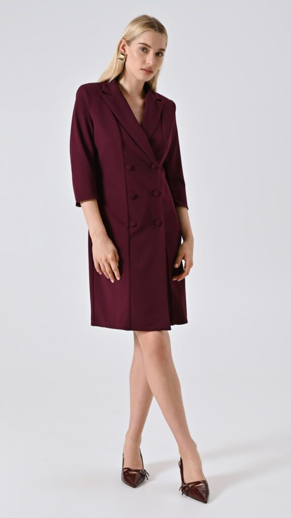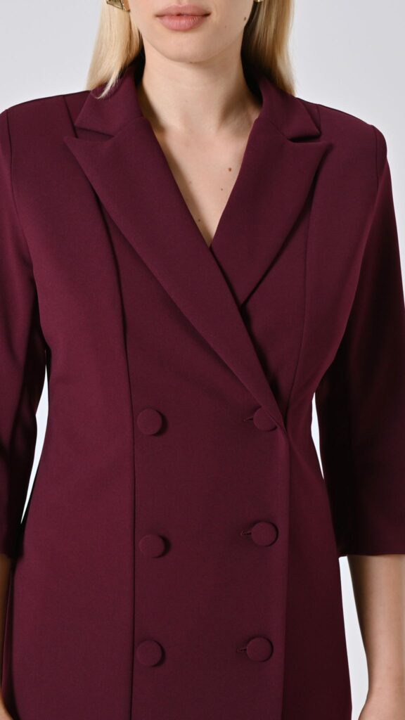 bordeaux, scuba mano crepe, revers a lancia e doppia fila di bottoni rivestiti