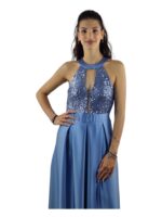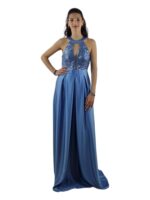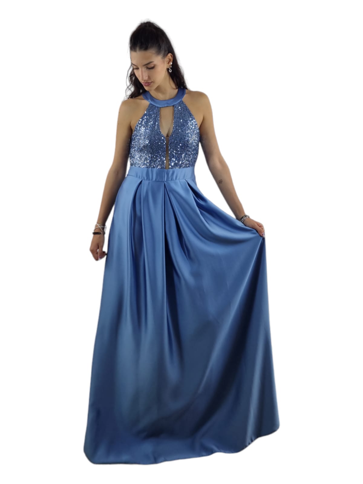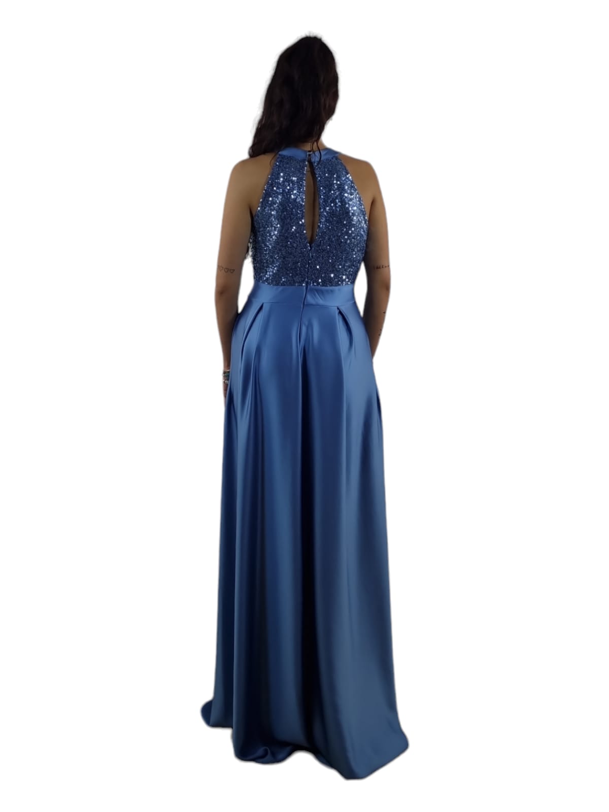 abito carta da zucchero, parte superiore con paillettes, scollo halter con spacco in mezzo al seno, parte inferiore in satin con pieghe