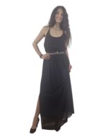 nero, modello morbido, con applicazioni gioielli multicolor sul punto vita, a bredelline incrociate dietro, con spacchi laterali