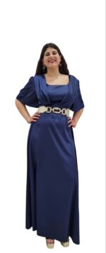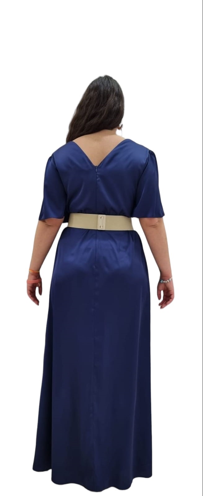 abito lungo blu notte effetto raso con drappeggio sul seno