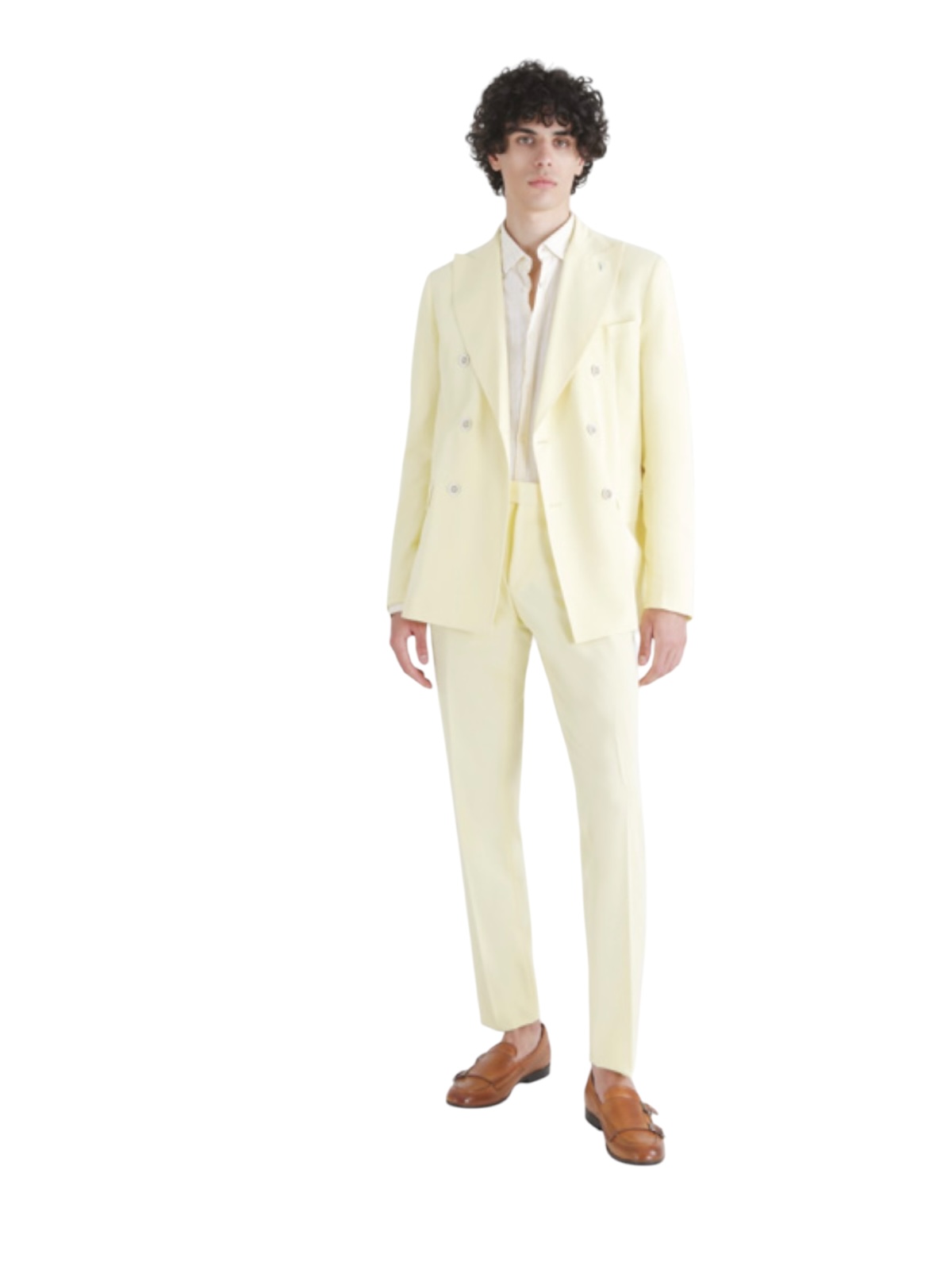 giallo, giacca doppiopetto con collo a lancia, tasche a filetto e due spacchi posteriori, pantaloni slim