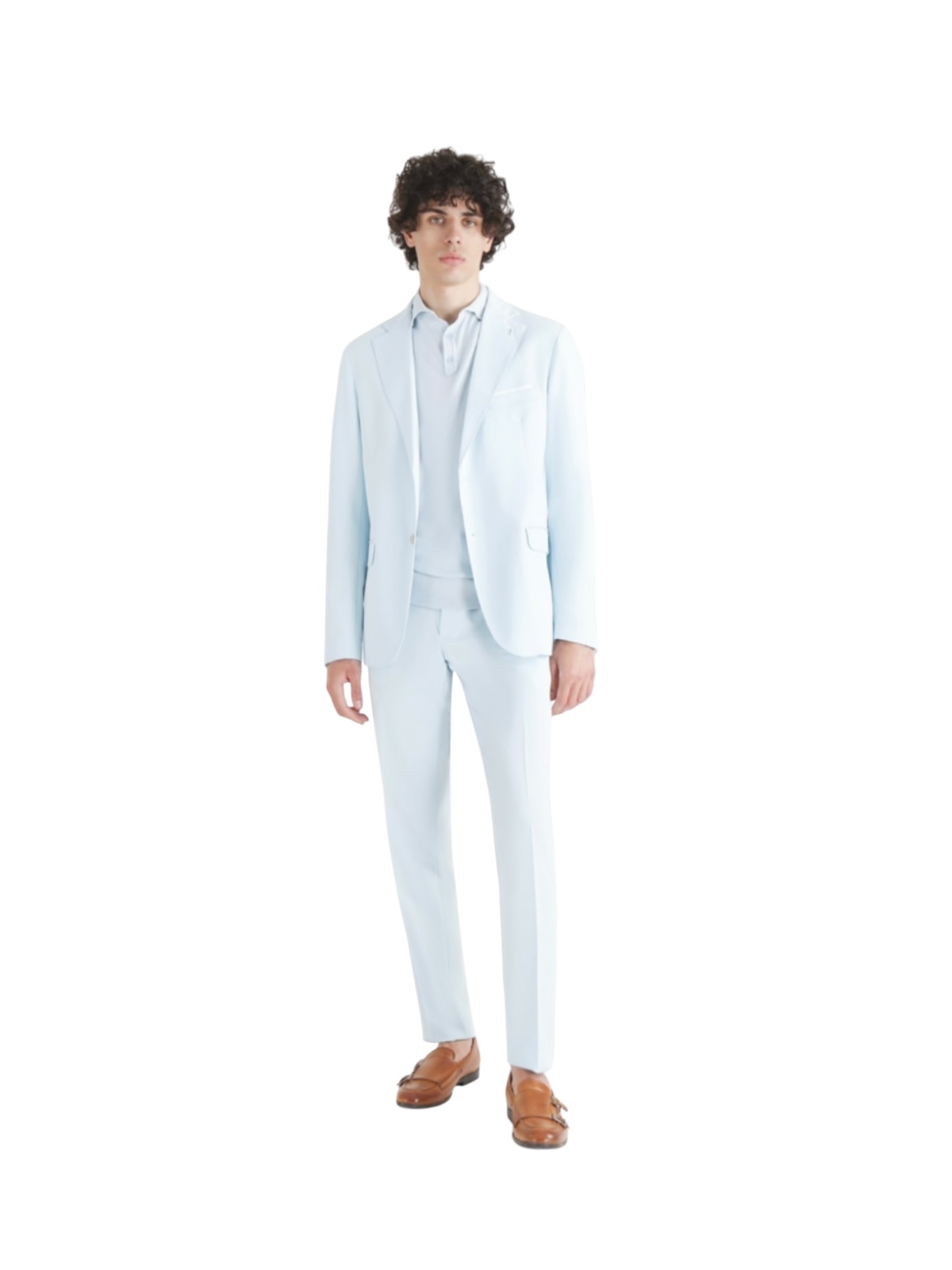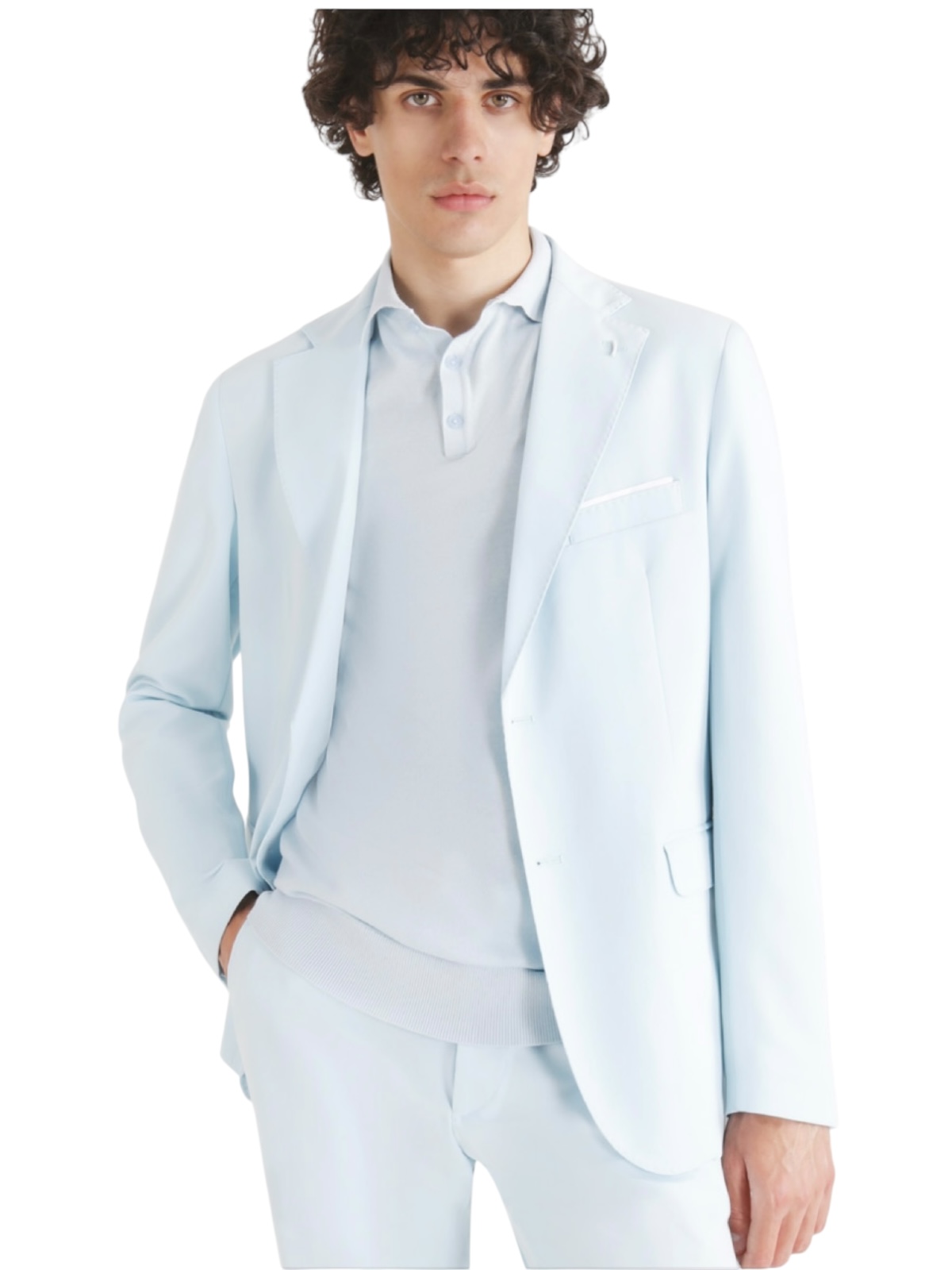 celeste polvere, giacca monopetto con 2 bottoni e tasche filetto, due spacchi posteriori, pantaloni slim