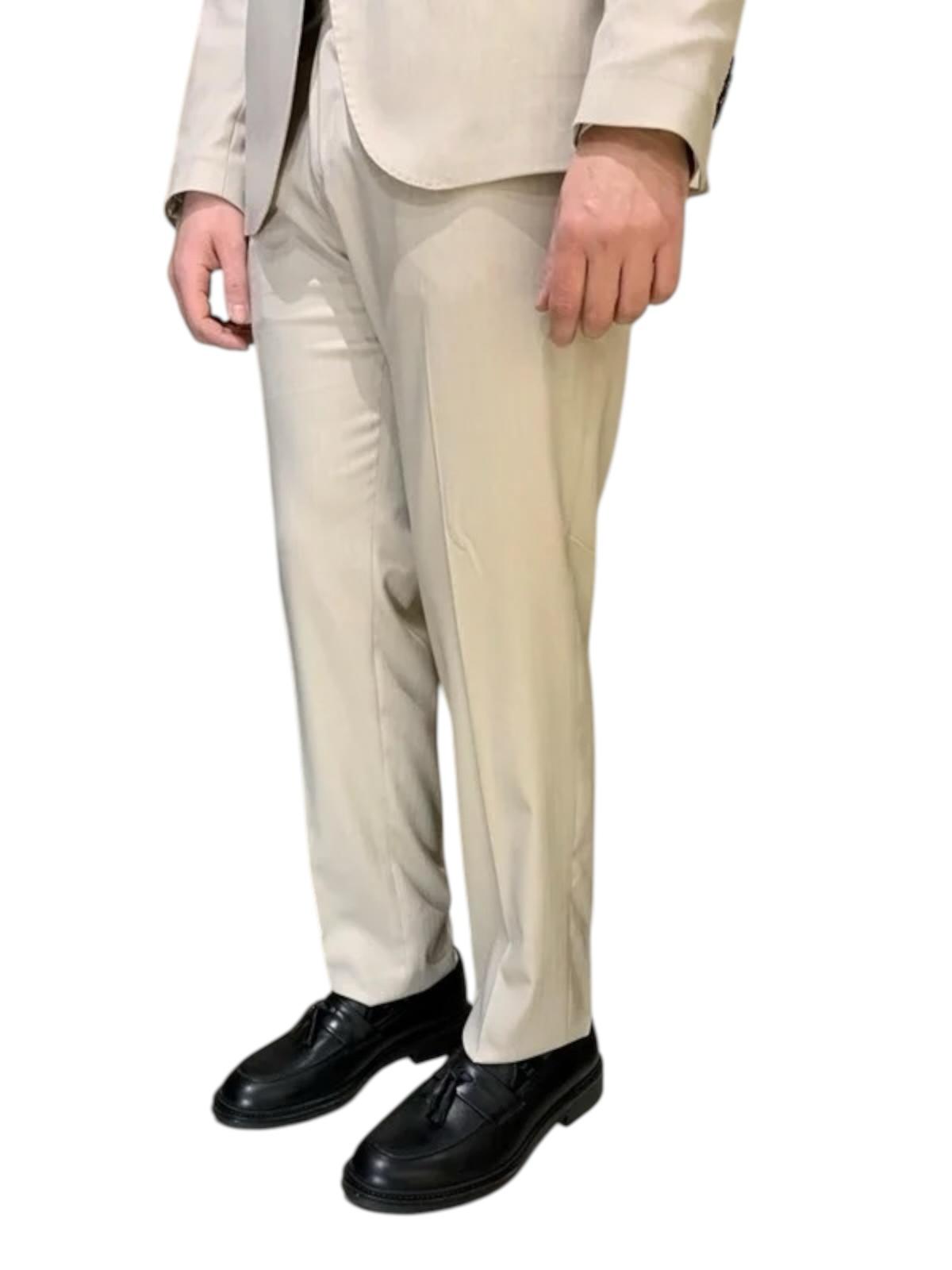 beige, effetto righe, giacca monopetto con 2 bottoni, tasche filetto e due spacchi posteriori; pantalone slim