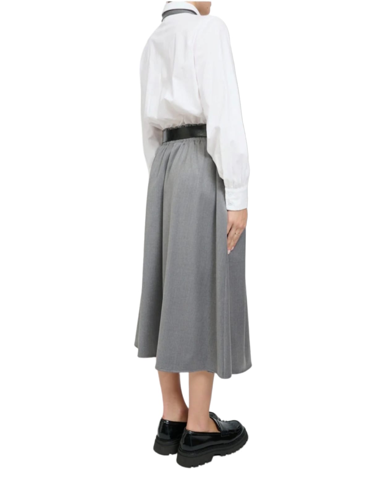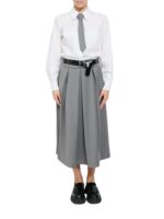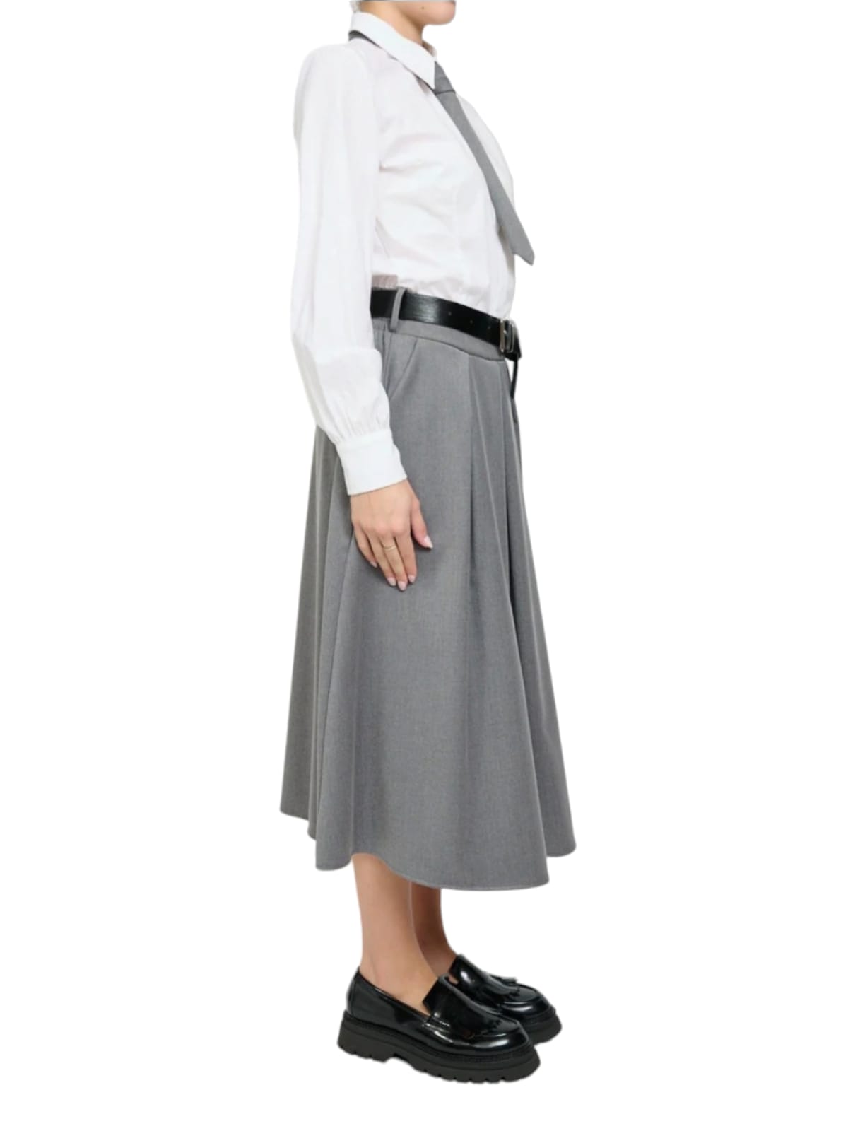 camicia bianca unita a gonna grigia, completo di cinta nera e cravatta grigia