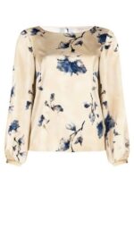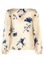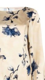 tessuto fluido e leggero, linea scivolata con maniche lunghe, scollo tondo e stampa floreale all-over sui toni del blu su base avorio