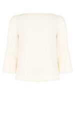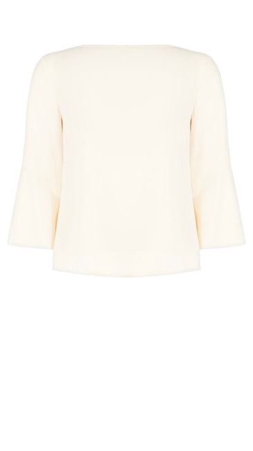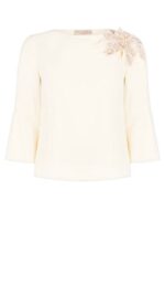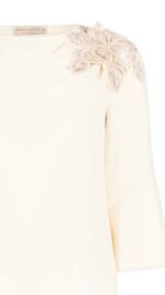 beige chiaro, giro gola con fiore di perline e paillettes sulla spalla sinistra, manica a tre quarti con volant finale