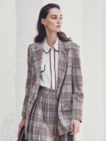 beige con tasche sul petto e rifiniture con piping bordeaux a contrasto, abbottonatura a vista