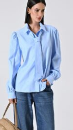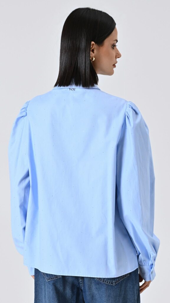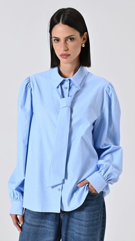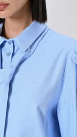 celeste, cotone piquรฉ arricchito da micro strass, maniche ampie a sbuffo, nastro removibile da annodare al collo e chiusura con abbottonatura coperta