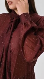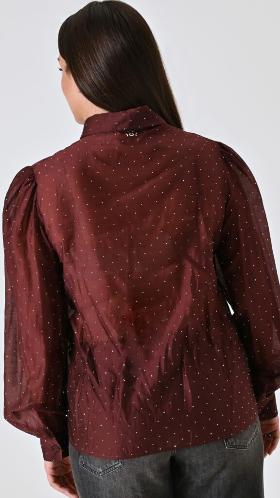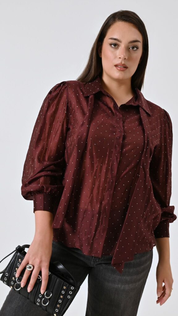 bordeaux, in mussola leggera impreziosita da micro strass con nastri da annodare al collo, maniche ampie rifinite da polsini strutturati e abbottonatura coperta