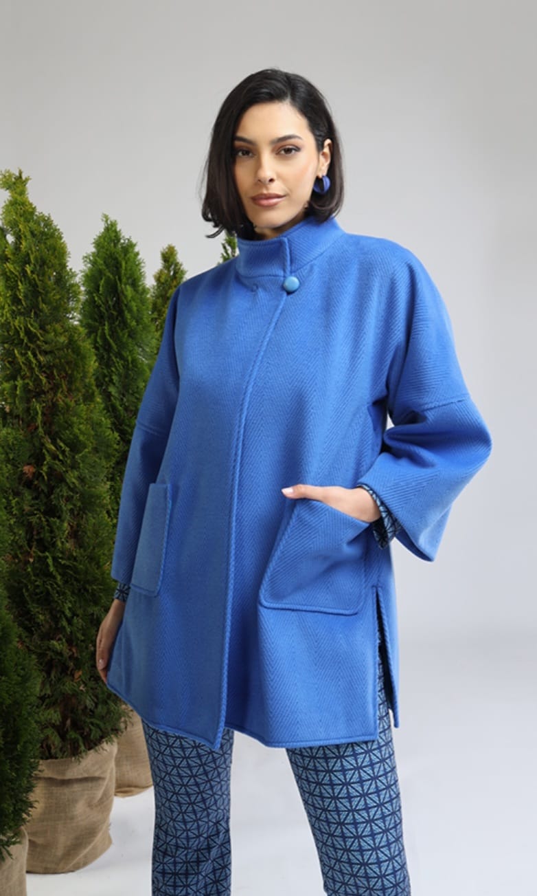 modello uovo, con bottone sul collo e tasche sul davanti, blu royal