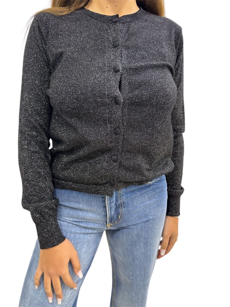nero laminato argento, bottoncini tono su tono, giro gola