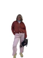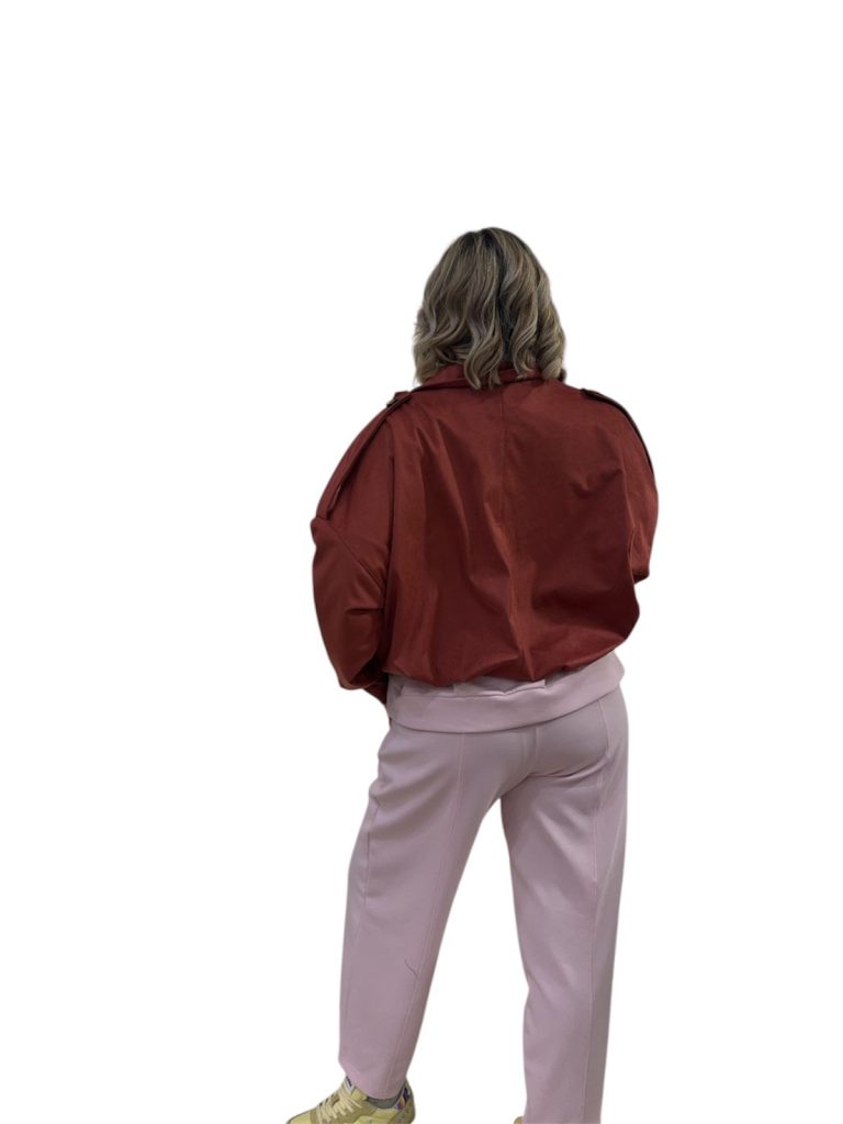 color coccio, modello bomber con bottoni sulla spalla, zip coperta, effetto arricciatura in vita
