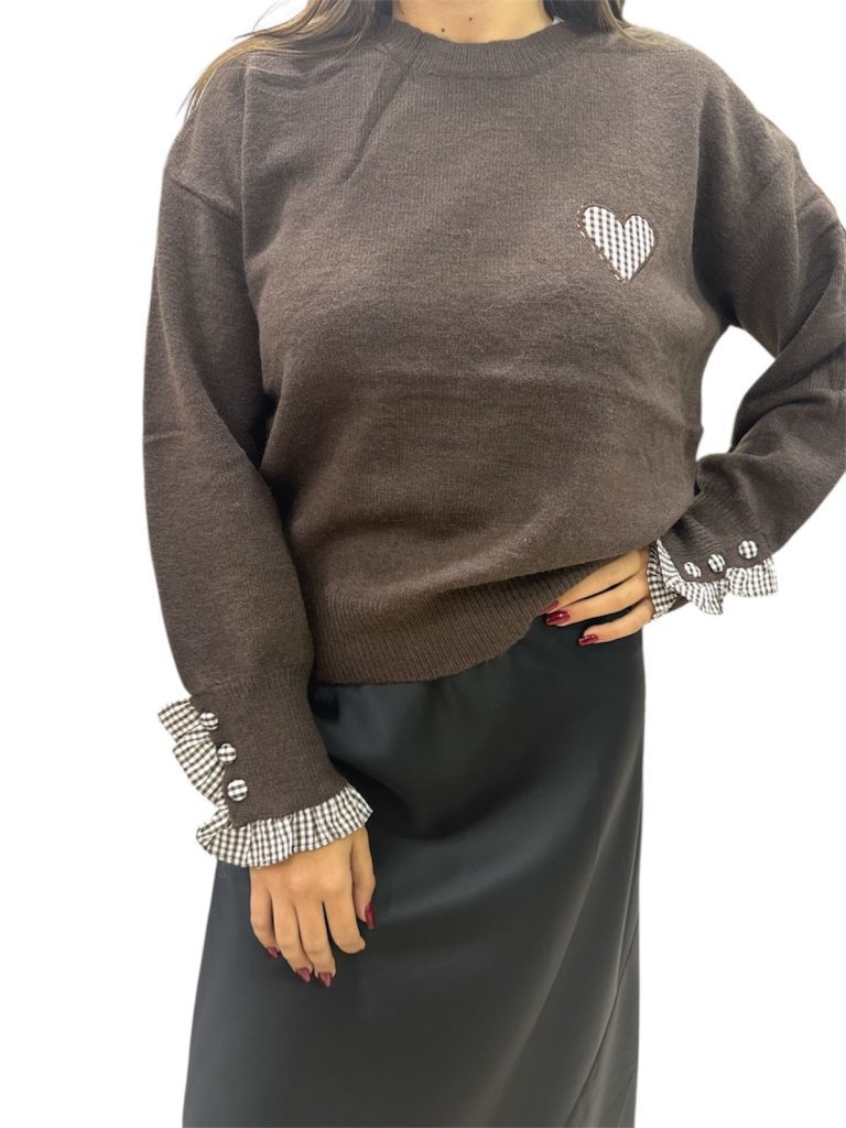 marrone, modello giro gola con dettaglio cuore, manica effetto camicia con merletto e bottoncini a quadri bianco e marrone
