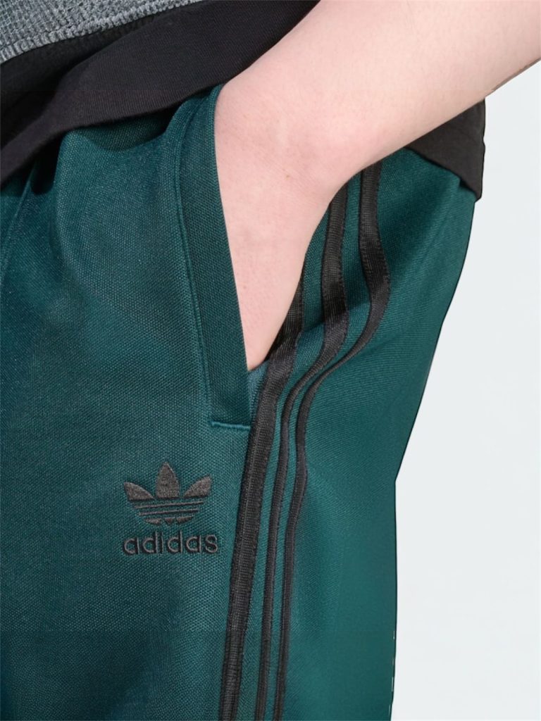 Pantaloni larghi sui fianchi e sulle cosce, verde bosco con logo ricamato e bande nere, con tasche laterale con cerniera ed elastico in vita