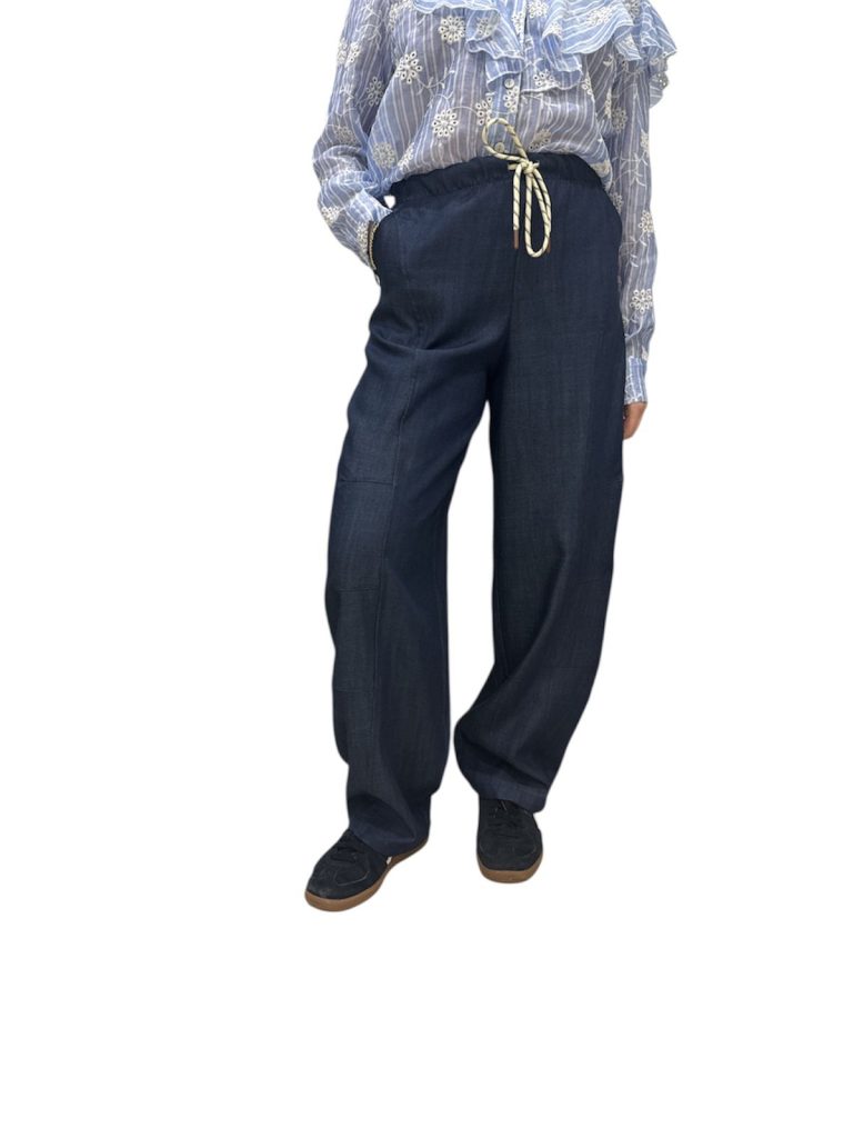 effetto jeans, lavaggio scuro, modello fluido con elastico e laccio in vita, tasca a filo