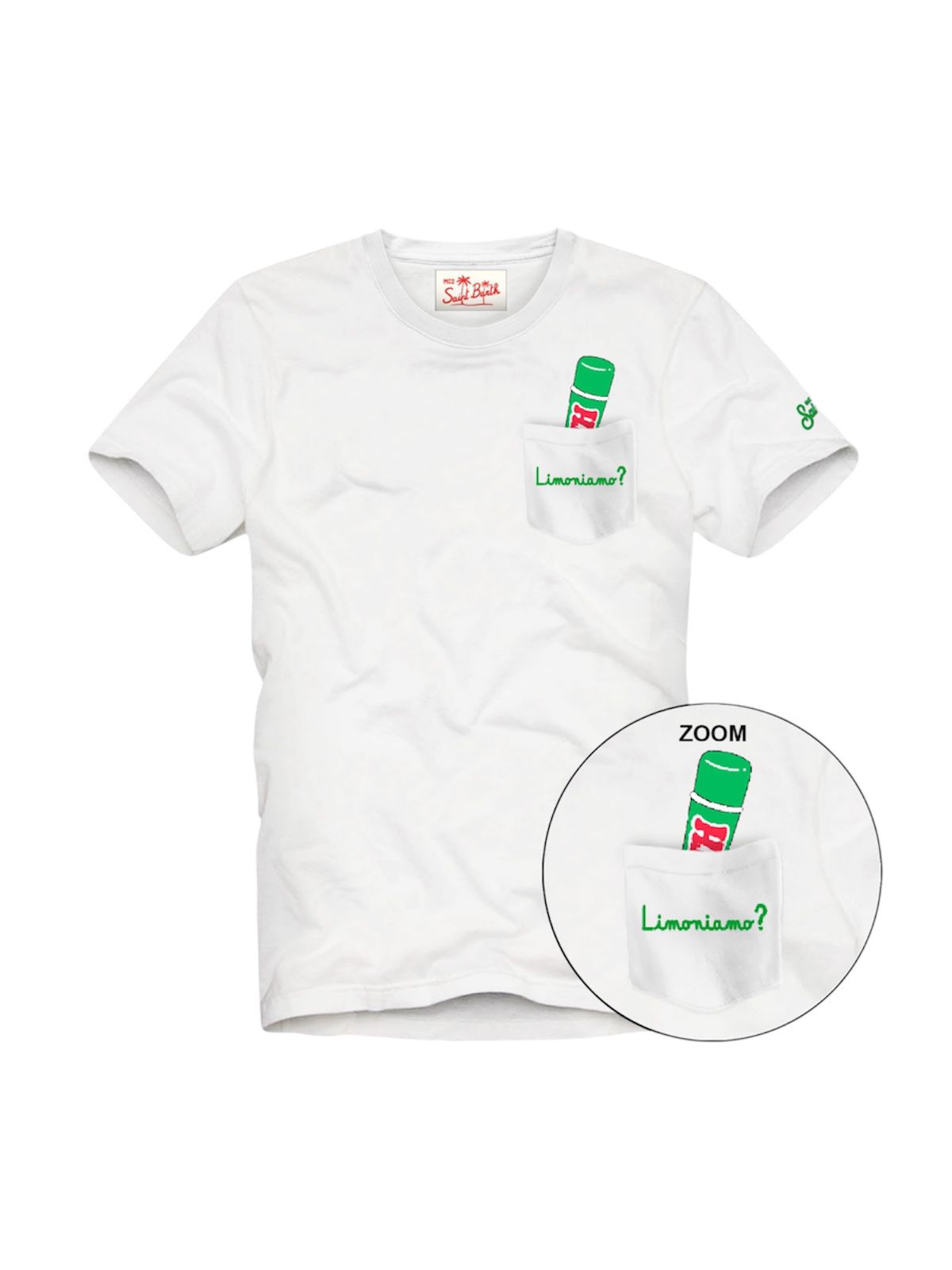 colore bianco, girocollo, modello a mezze maniche, taschino sul petto con stampa ghiacciolo e scritta ricamata ” limoniamo?” in verde