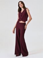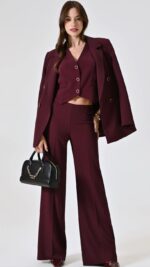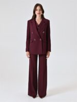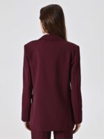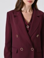 bordeaux con sottile riga nera, giacca linea over con spalline imbottite, patte effetto tasca e fodera interna. modello doppiopetto con bottoni tono su tono con dettaglio dorato