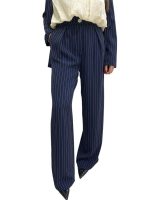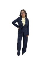 blu notte e bianco, giacca monopetto con bottone riflesso madreperla, cinta in vita e spallina imbottita, pantalone palazzo con pence, tasca a filo e stesso bottone