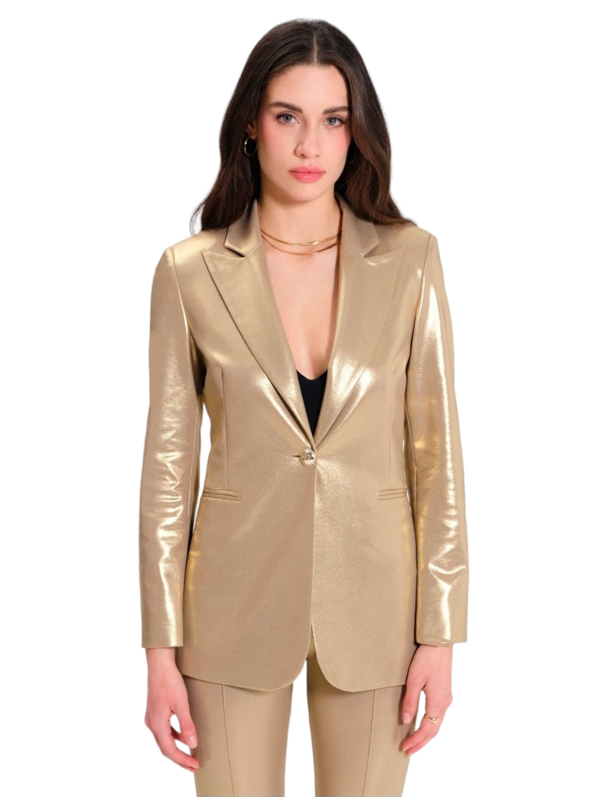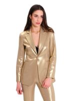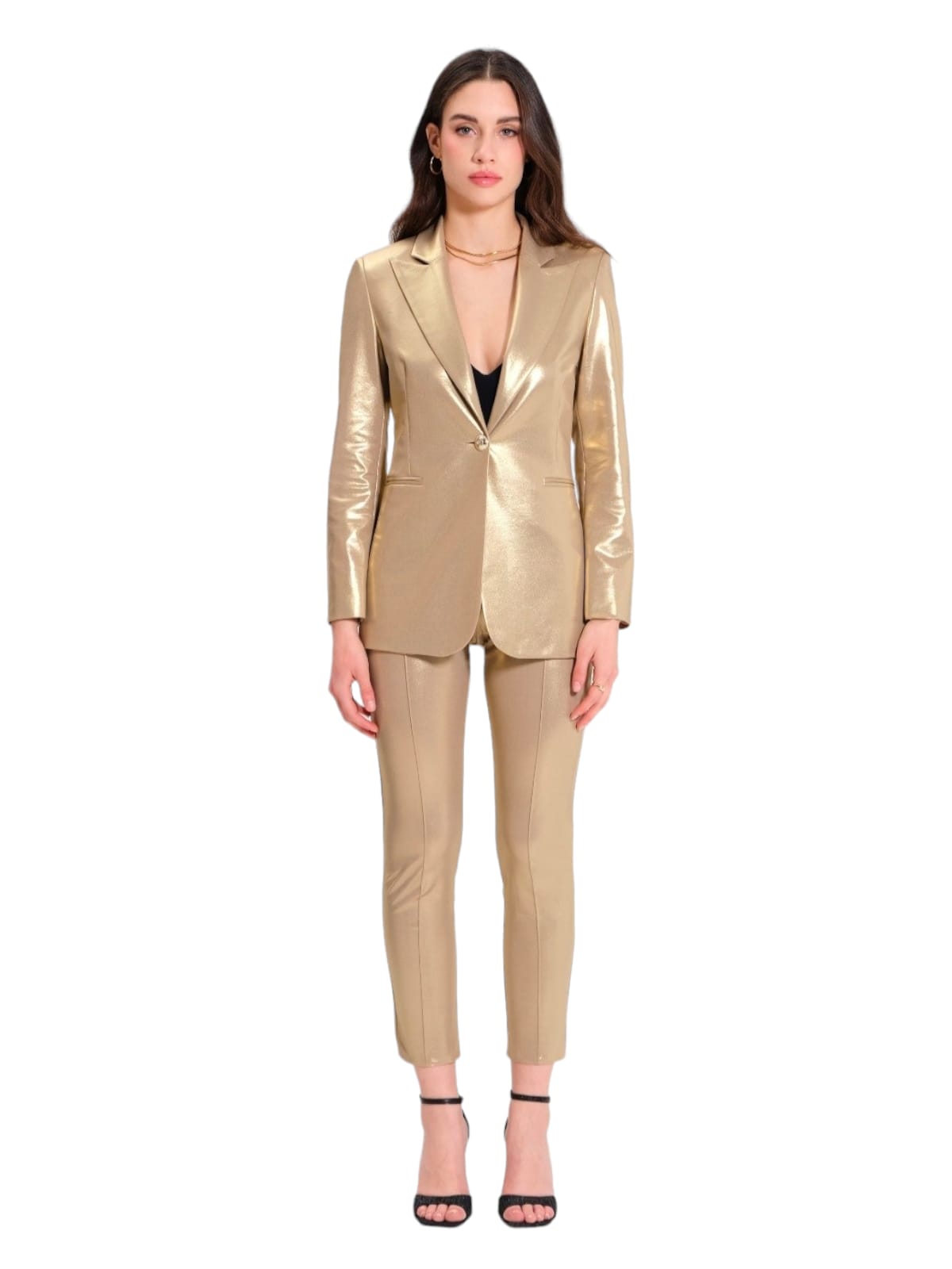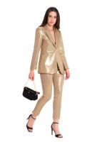 giacca monopetto e pantalone dritto elasticizzati, effetto spalmato