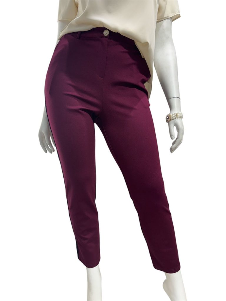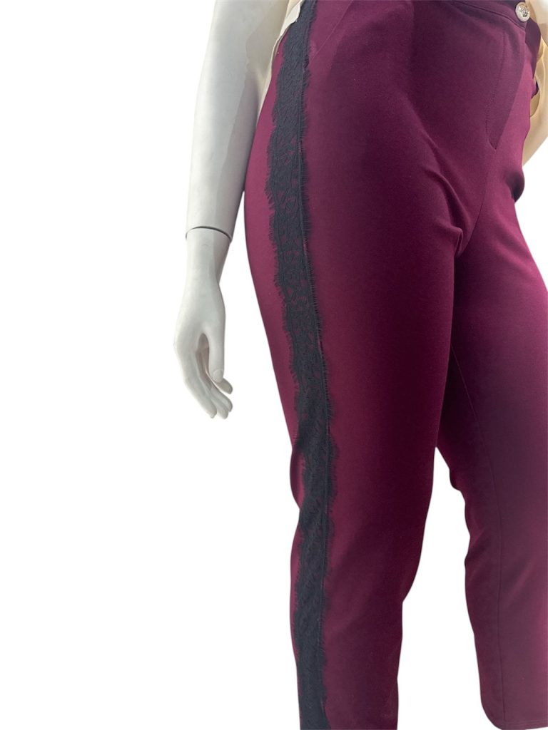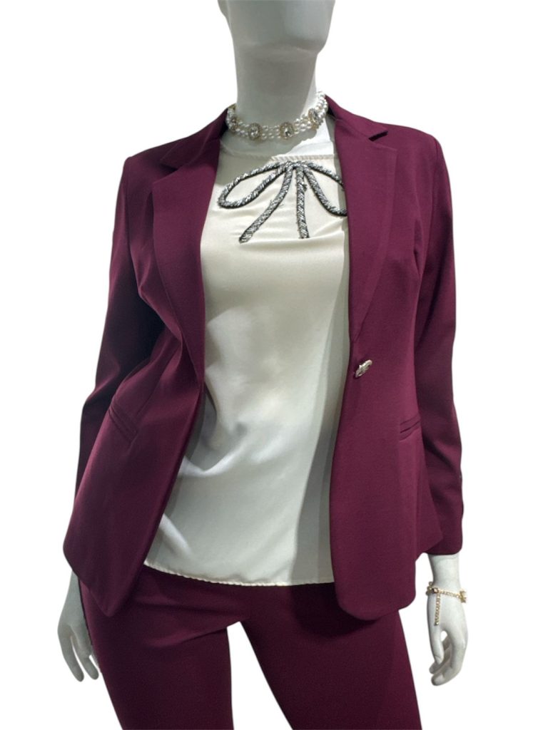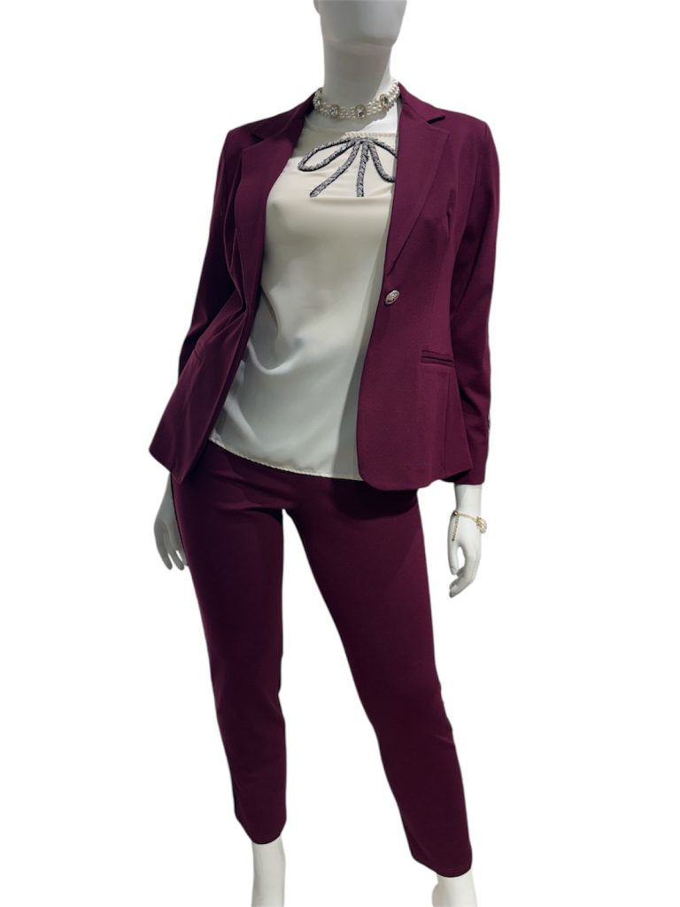 bordeaux con dettagli pizzo nero sul laterale , giacca monopetto, con un bottone dorato ed effetto tasche; pantalone modello dritto