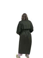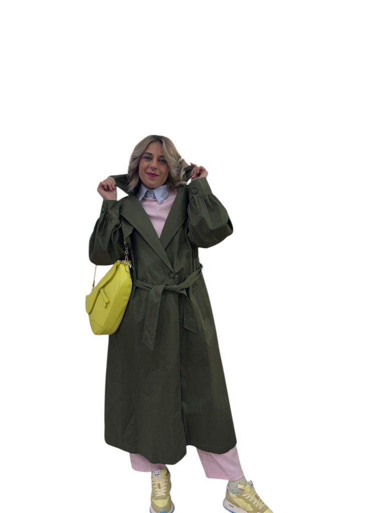 verde militare, modello doppiopetto, con cinta e tasche