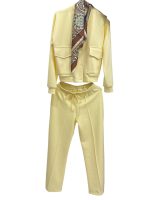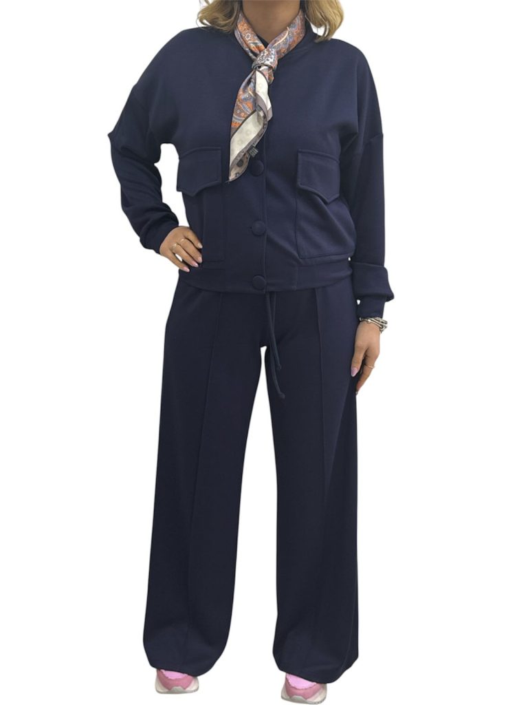 pantalone modello palazzo e giacchino con tasche con foulard abbinato