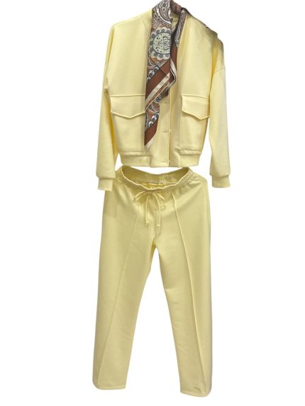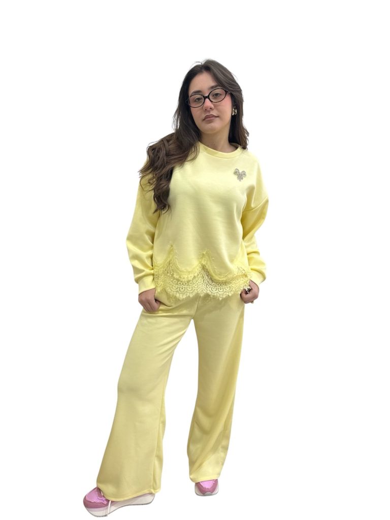 gialla con dettaglio spilla argento, pantalone palazzo con elastico in vita